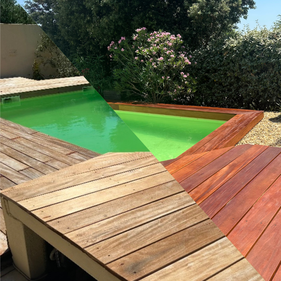 Pour redonner éclat et protection à ce bois, nous avons utilisé le traitement Coril Pro, un produit de qualité professionnelle parfaitement adapté à ce type d'essence...