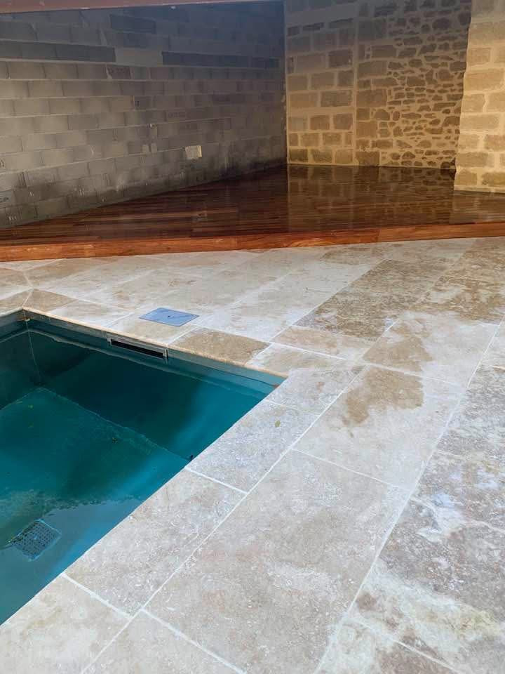Terrasse en bois Cumaru, mariée avec élégance au travertin et inox pour une ambiance chic et épurée autour de la piscine.